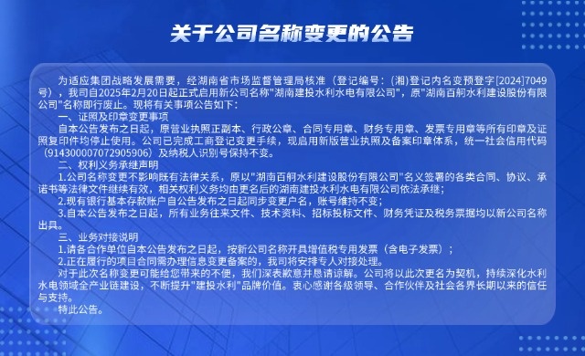 2022年9月,原湖南建工集團與原湖南交水建集團合并組建湖南建設投資集團。原雙方集團旗下的湖南百舸水利建設股份有限公司和湖南建工集團水利水電工程公司合并為湖南建投百舸水利公司,實行兩塊牌子(百舸水利、建工水利)管理,為湖南建投集團唯一水利建設企業(yè)。2024年9月,公司正式更名為湖南建投水利水電有限公司(簡稱湖南建投水利),統(tǒng)籌管理“百舸水利”“建工水利”“施工公司”“疏浚公司”等子品牌。